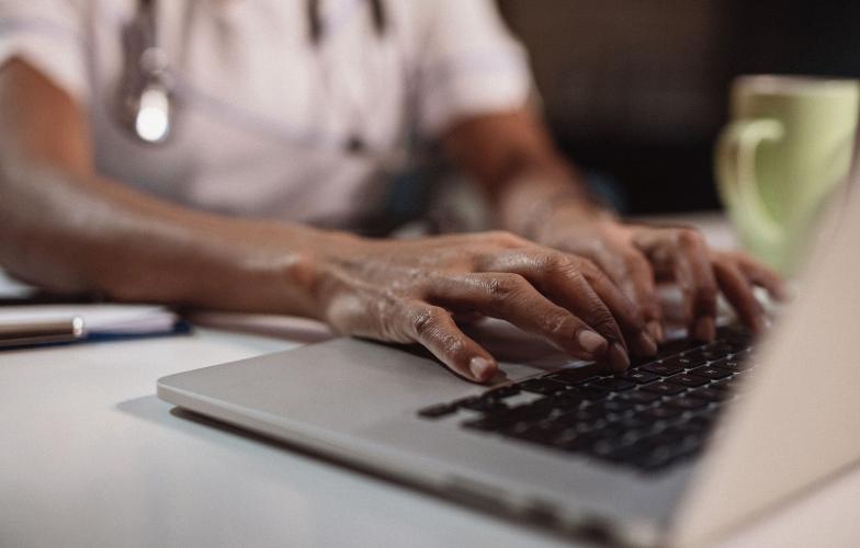 A physician typing on a laptop
