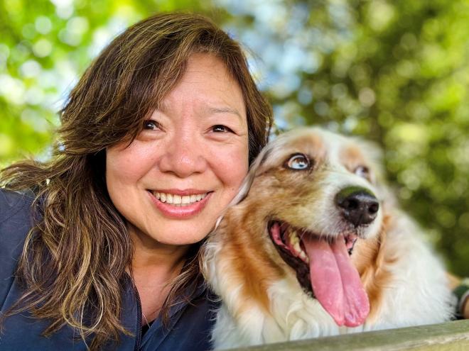 Dr Charlene Lui wearing pink shirt and smiling for Pink Shirt Day.